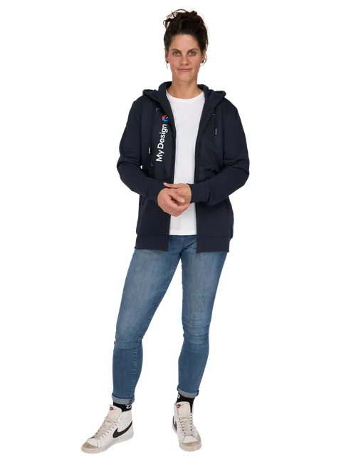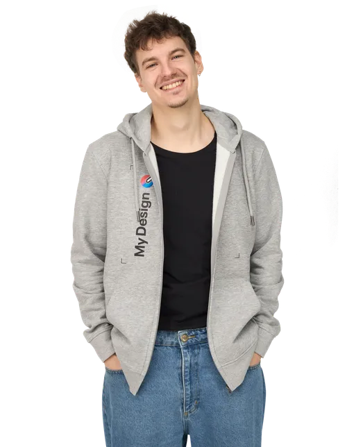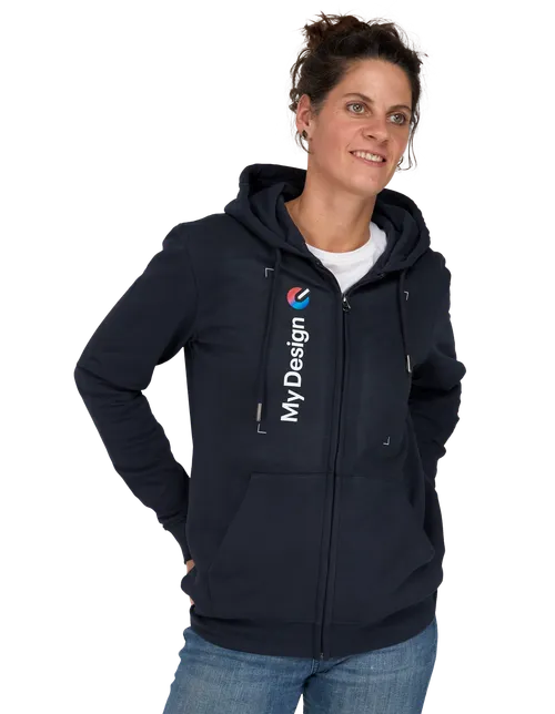 Die Sweatjacke kann auf der Brust und am Rücken bedruckt werden.